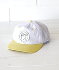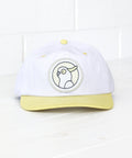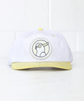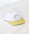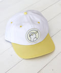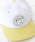 A super dooper cheeky hat with a cockatoo stitched right on the front of it in a sunshiney yellow two-tone dad cap. Radness!