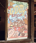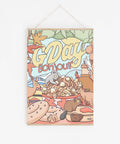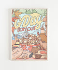 To celebrate our French connection, Brent has started an Aussie-Canadian themed series of illustrations and this is the first which features some iconic Aussie and Canadian foods and animals with a background of a surfing Koala and the Biosphere, framed by Maple and Eucalyptus leaves.