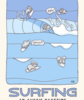 This poster features a Brentos artwork of a small colony of Koalas surfing, having fun and cheering each other on. It contains beautiful vintage typography underneath with the text 'Surfing - An Aussie Pasttime'.