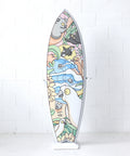 The artwork is handdrawn, blown-up and printed on a special fabric which is then glassed underneath the surface of the board. This means you can take the board out in the surf without risking paint chipping off or extra weight on the board.