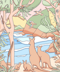 A family mob of Kangaroos hop up to the ocean's edge and admire the surf as Kookaburras fly above and tiny surfing koalas look on to find their perfect paddle out spot.