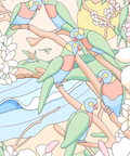 'Rainbow Beach' captures a group of Rainbow Lorikeets and coastal flowers as a wave rolls into the beach.