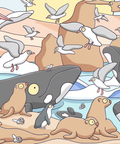 Sea birds, seals, Southern Right Whales and surfing koalas gather in the Great Australian Bight Marine Park. An illustration adapted from Brentos' book Wild Australia. Also available in portrait orientation here.