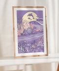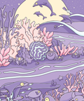All the marine life come out to play on a dazzling full moon-lit night on a bioluminescent coral sea reef. An illustration adapted from Brentos' book Wild Australia. Also available in Landscape orientation here.