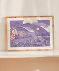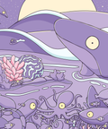 All the marine life come out to play on a dazzling full moon-lit night on a bioluminescent coral sea reef. An illustration adapted from Brentos' book Wild Australia. Also available in Landscape orientation here.