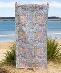 This giant beach towel features all the Aussie icons, fairy bread, a boxing kangaroo, sausage snag, vegemite, prawns, a huntsman, a koala and the beach.